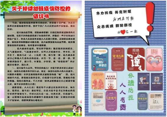印发了《新冠肺炎防控知识手册》、《关于持续加强疫情防控的倡议书》等宣传手册、宣传页,对新型冠状病毒感染的肺炎的相关知识进行了答疑解惑。目前我国疫情防控形势持续好转,但疫情尚未解除,现阶段境外输入日益加剧,疫情防控不容麻痹松懈,提醒居民出入务必佩戴好口罩,做好个人防护,如有省外返济或境外旅居史的要及时上报。