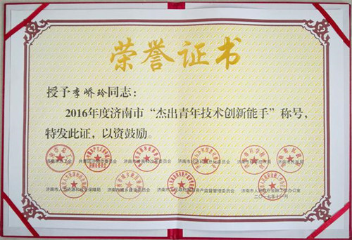 六分公司青年职工李峤玲榜上有名,被授予2016年度济南市杰出青年技术创新能手称号。