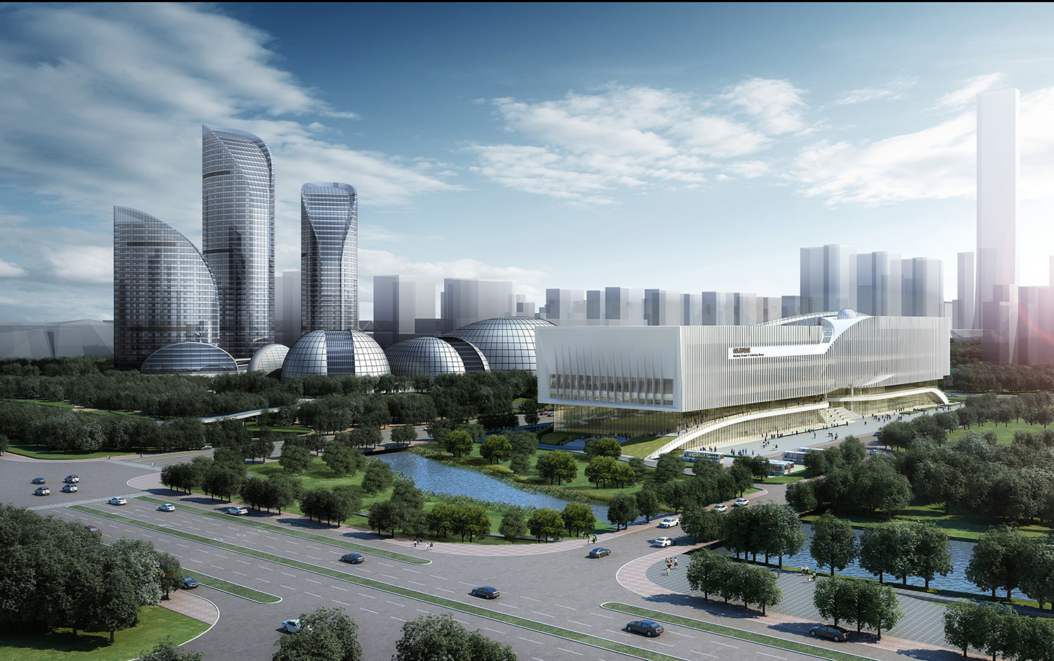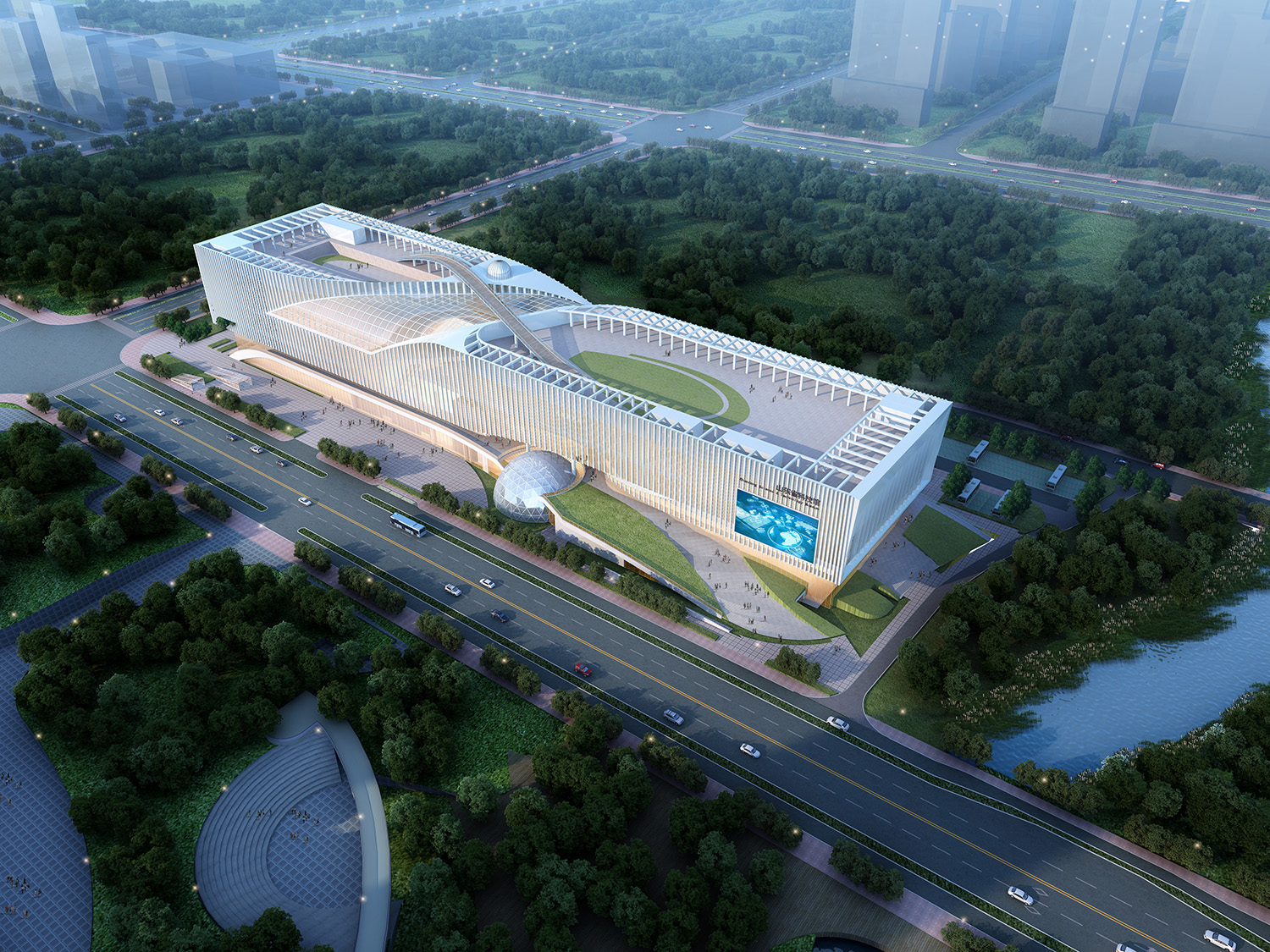科技馆主体建筑位于场地中央,场地主入口位于北侧日照路一侧,参观人员由北面进入科技馆,北侧广场设有排队进场的广场集散区域。场地南侧沿规划道路设置多个出入口,西侧为双创中心与科研人员出入口,中部为科技馆次入口及团体入口。建筑东侧为临时展厅出入口,可独立举办各种展览活动,场地西侧结合腊山河景观带设有一个地景化的绿坡平台,平台将场地的车流和参观游览的人流从高度上完全分离开。