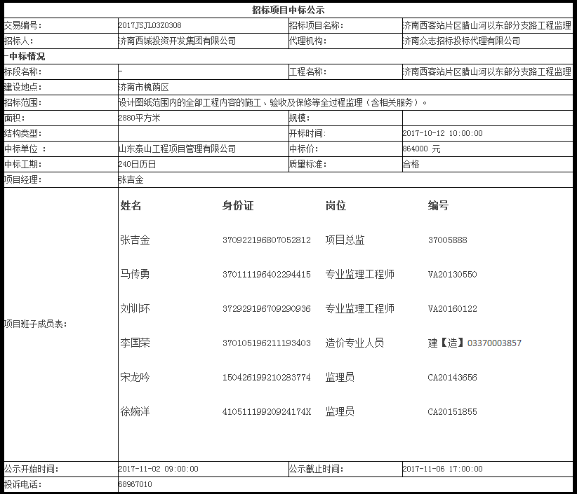 济南西客站片区腊山河以东部分支路工程监理中标公示