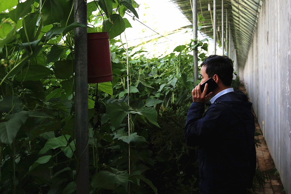 7:30当我们到达陈德国所在的大棚区时,他已经工作了一个小时。“像这种老叶、黄叶要抓紧摘掉了,到了一定年限就只吃饭不干活,影响光合作用。”在芸豆种植棚,陈德国正在电话指导着种植户。