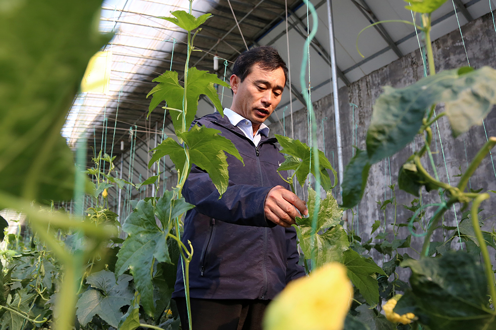 在丝瓜棚,陈德国边检查着丝瓜生长情况边解释说“这个棚的种植户贪多,总想着一个藤上结好几个瓜,但实际上果多不等于产量高,有时候一个藤上好几个果反而营养供不上了。”对于各类蔬菜种植,经过18年的不断实践学习,陈德国逐渐总结出了自己的一套“种植经”。