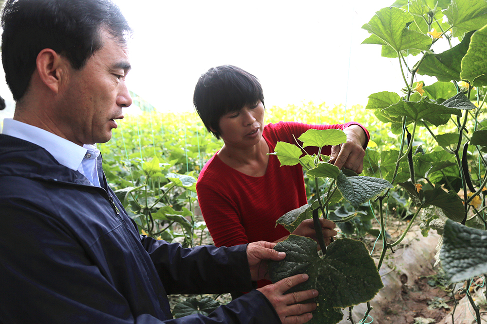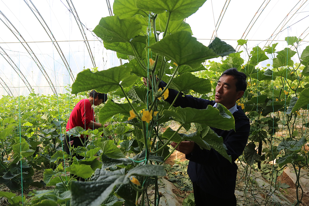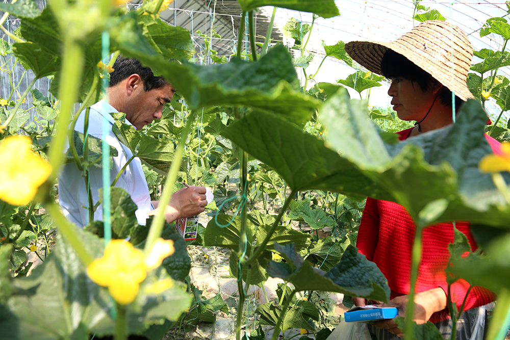 “打药一定要按时打按量打,提前打了没效果,拖后了就容易产生残留,”陈德国仔细指导着黄瓜种植户。