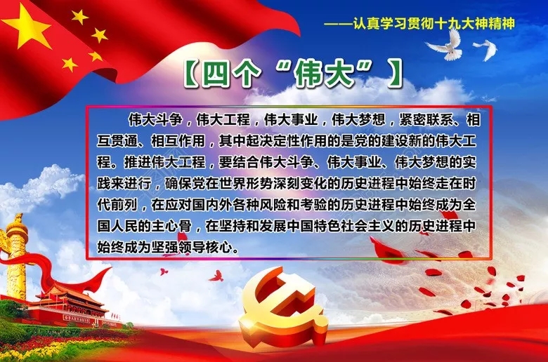 党的十九大修改党章明确把统揽“四个伟大”写了进来,“四个伟大”指的是进行伟大斗争、建设伟大工程、推进伟大事业、实现伟大梦想。