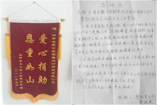 5月24日,菏泽市巨野县大义镇二街樊双喜委托家人专程来到济南金衢公路勘察设计研究有限公司,将一面写有“爱心捐助 恩重如山”的锦旗和一封感谢信送到公司工作人员手中,借此表达对济南金衢公司全体员工对樊双喜一家及时伸出援助之手、慷慨解囊渡难关的感激之情。