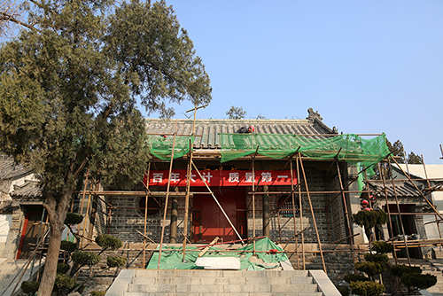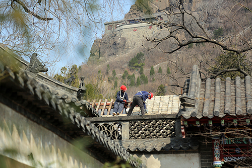 在现场可以看到,冬季过后,“修炼内功”的综合管线敷设、地形塑造、受损的砖作石作木作基底清理工作已基本完成,“湿作业”阶段已经全面展开。目前正在进行中的主要工作为建筑屋面的修缮,建筑墙体的修补,路面、石阶、古砖的清理修复,建筑木构件的砍活与重新上漆,木构件表面彩绘的清理除尘等工作。
