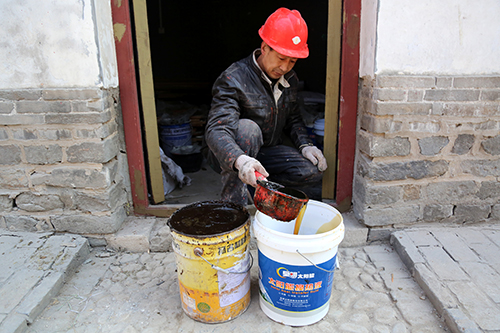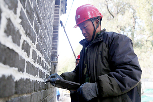 古法之三,砖药与青砖白灰。在华阳宫内的古建墙壁上,很多砖块因为年代久远及腐蚀原因,有不同程度的破损,对墙面破损较轻微的砖块,以修复方式,不作替换,具体用水泥、松烟与砖沫制成与墙面颜色一致的砖药,用磨平与压死的方式修补,还原砖块原样。在墙面修补方面,采用青砖白条灰勾缝进行处理,恢复古建筑外貌。据了解,一位技术工人一天约能完成高度约50公分的青砖白条灰勾缝修补工作。