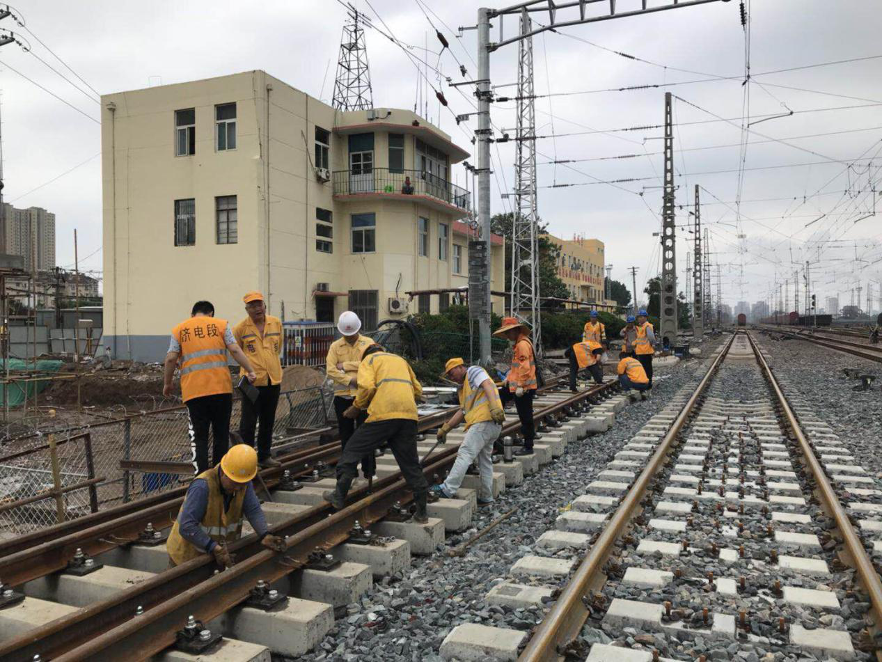 为保证历城站中咽喉站场改造顺利按期完成,确保胶济铁路6月1日恢复120km/h常速运行,项目部全体职工以饱满的精神面貌开拓创新,攻坚克难,积极备战,确保要点施工顺利展开。一是统筹安排、超前谋划,提前为下道工序施工做好人力、物力和机械设备的准备,确保工程环环相扣、连续展开。二是充分发挥主观能动性,通过精心组织,以创新的姿态、提前谋划,采取了利用济南铁路局5月份工务集中修大天窗的时间拉入道岔和提前封锁侧线纵移轨排方式进行施工。此次方案优化不仅保证了工程顺利实施,还减少了因施工对铁路运输造成的影响,得到了济南铁路局涉铁工程办公室在路局全线施工计划会上的通报表扬。三是积极细化要点施工方案,优化资源配置,强化现场协调配合,利用天窗点外时间预铺道岔,主动联系济南工务段、济南电务段等设备管理单位做好点前验收工作,不放过任何一个细节,为道岔的顺利拉入打下坚实基础。