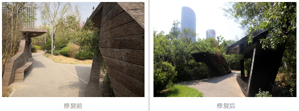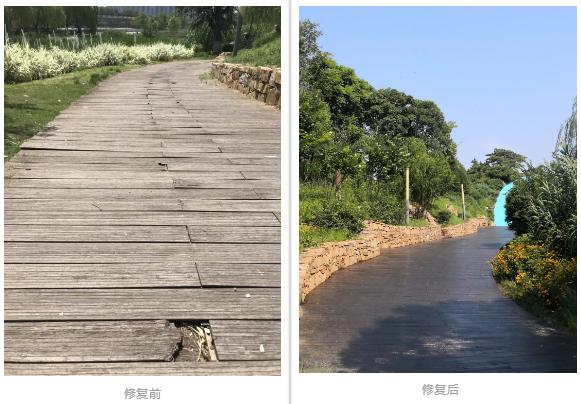 本次工程主要包括高速广场及三馆广场重竹地板维修、木栈道路修复、局部河道清淤三项主要内容,其余还有修补渗水方砖地面、广场金属栏杆刷漆、广场区域休息座凳整修、广场区域木质墙面固定刷漆、跨河石桥栏板地面局部饰面板缺失等零星工程,均为在原貌基础上进行修复。工程完工后,pg电子