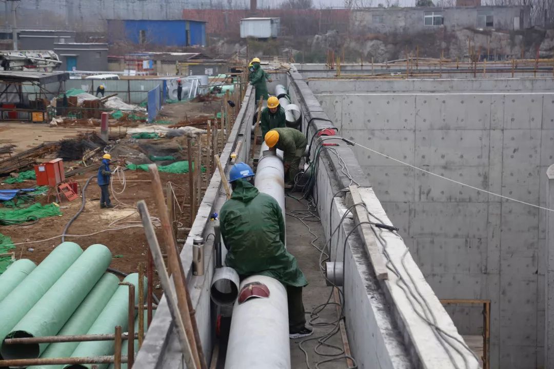 腊山水质净化厂项目控制用地3公顷,设计处理规模40000m³/d,主要服务于腊山片区及玉符河两岸收集的生活污水,工程规模4万吨/日,处理出水满足《城镇污水处理厂污染物排放标准》的一级A标准,污水处理主体工艺采用预处理+AAO工艺+深度处理工艺。目前,项目投入近240名工作人员,各通水单体的建设正加班加点推进中,努力确保按计划完成。
