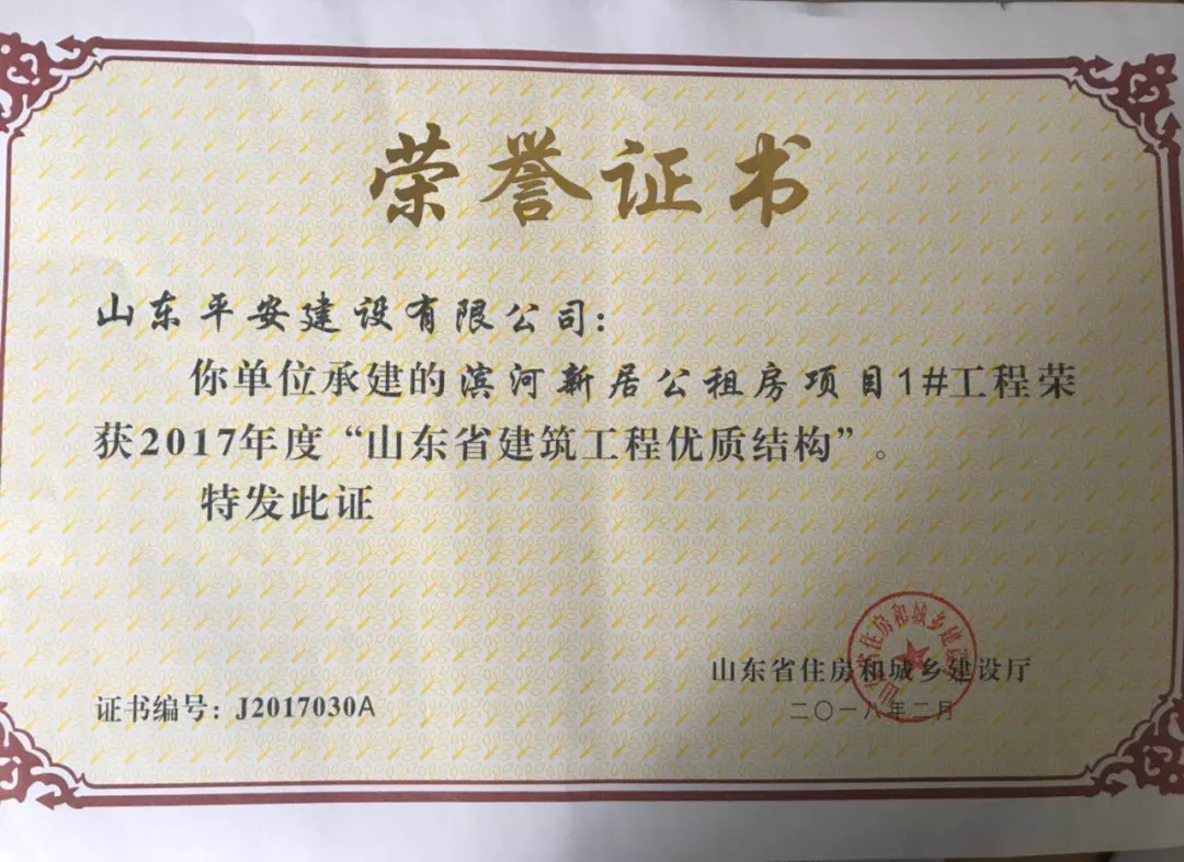 近日,由pg电子 负责建设的滨河新居公共租赁住房工程1#楼,在山东省住房和城乡建设厅组织的2017年度“山东省建筑工程优质结构”评审中,凭借过硬的质量、完善的管理顺利通过专家考评,喜获“山东省建筑工程优质结构”奖。