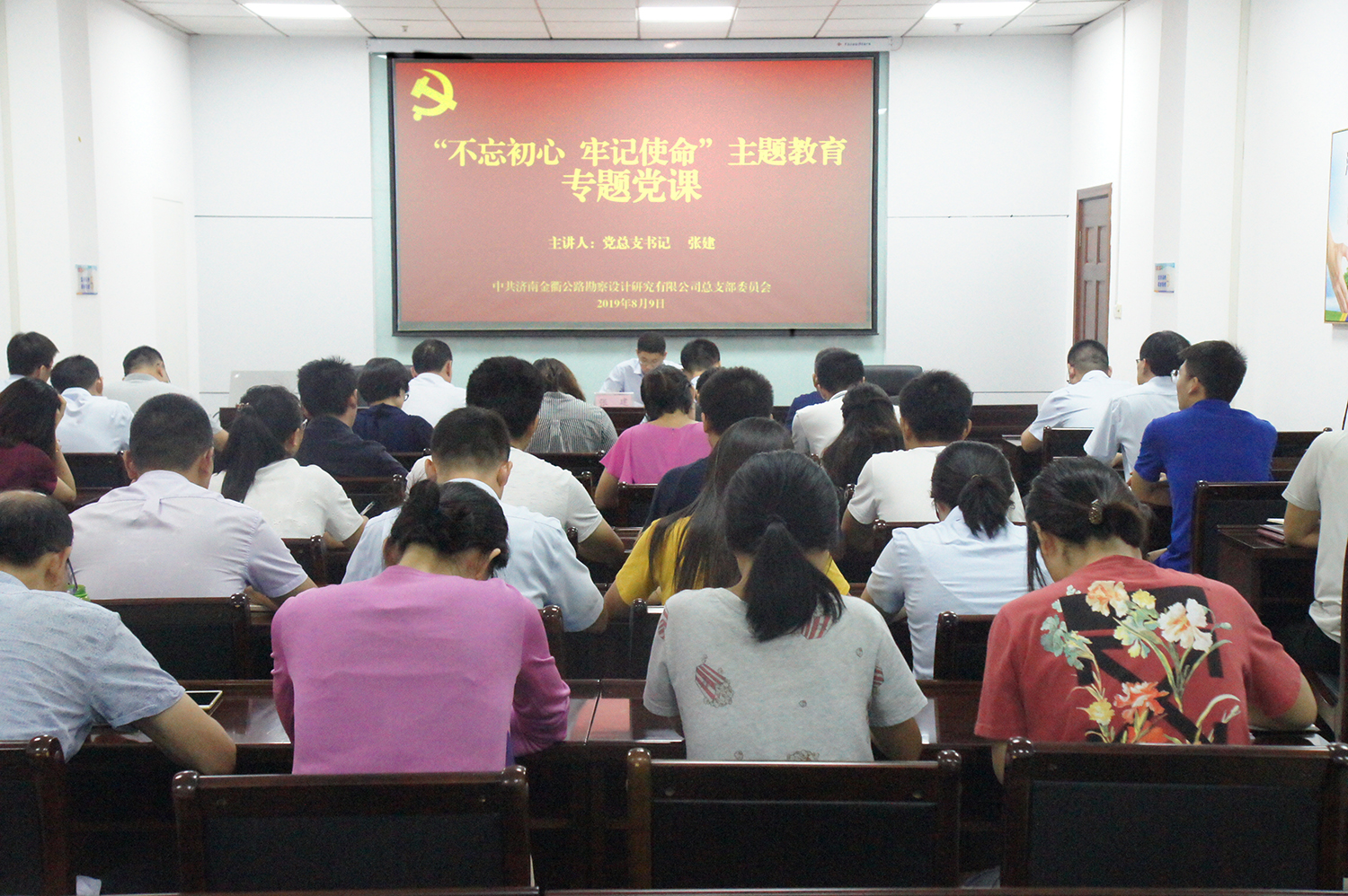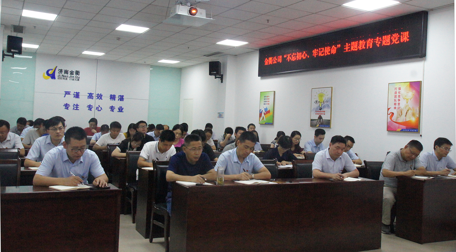 为深入推进“不忘初心 牢记使命”主题教育,不断加强党员干部教育管理,8月9日,济南金衢公司党支部开展主题教育专题党课活动,全体党员、中层以上管理干部、入党积极分子。公司党总支书记张建以“新常态下如何立足岗位以实践行动诠释实干、担当”为题,为全体参加人员上了一堂内涵丰富、意义深远的党课。