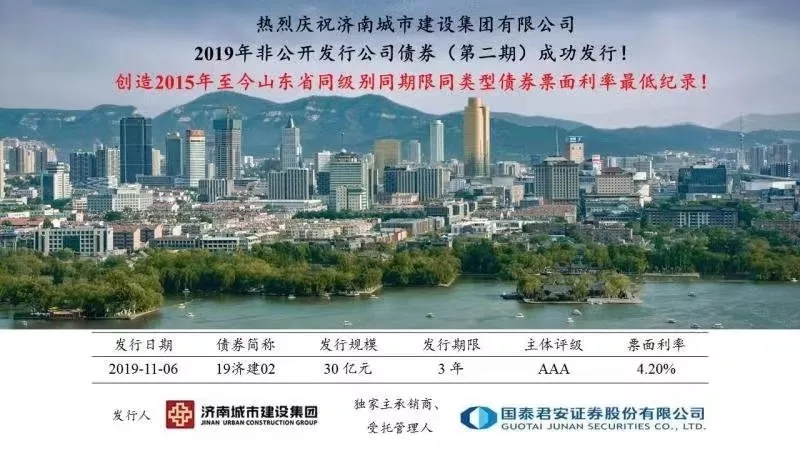 非公开发行2019年公司债券(第二期)(“19济建02”)发行圆满落地,创造2015年至今山东省同级别同期限同类型债券票面利率最低纪录。本期债券发行得到了市场的广泛认可,投资者认购踊跃。19济建02低利率发行,充分展现了投资者对pg电子