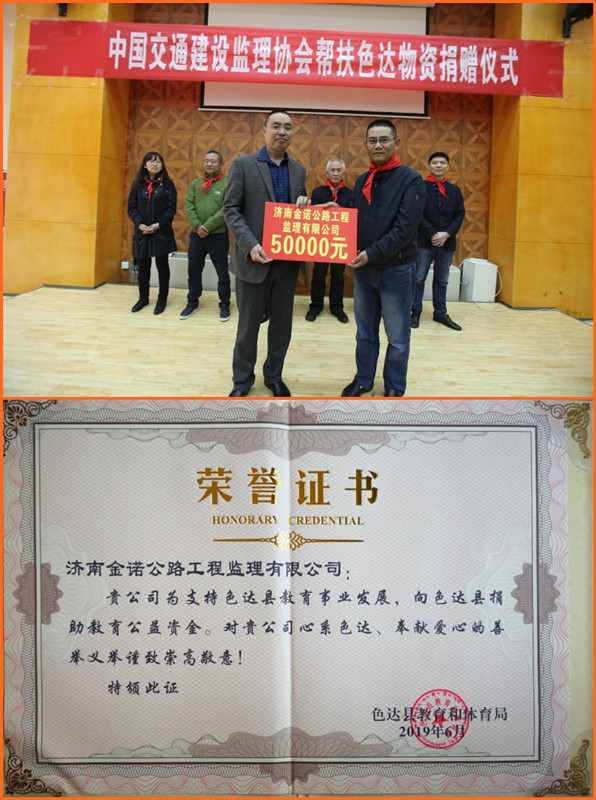 积极参与脱贫攻坚事业是一个有社会责任感的pg电子服务社会、回报社会的重要体现。不忘初心,牢记使命,济南金诺公路工程监理有限公司作为中国交通监理协会的理事单位,将持之以恒的为贫困地区脱贫攻坚事业贡献力量,持续关注色达孩子的教育和成长,尽pg电子的绵薄之力,为社会和谐进步和民族团结和谐贡献力量。