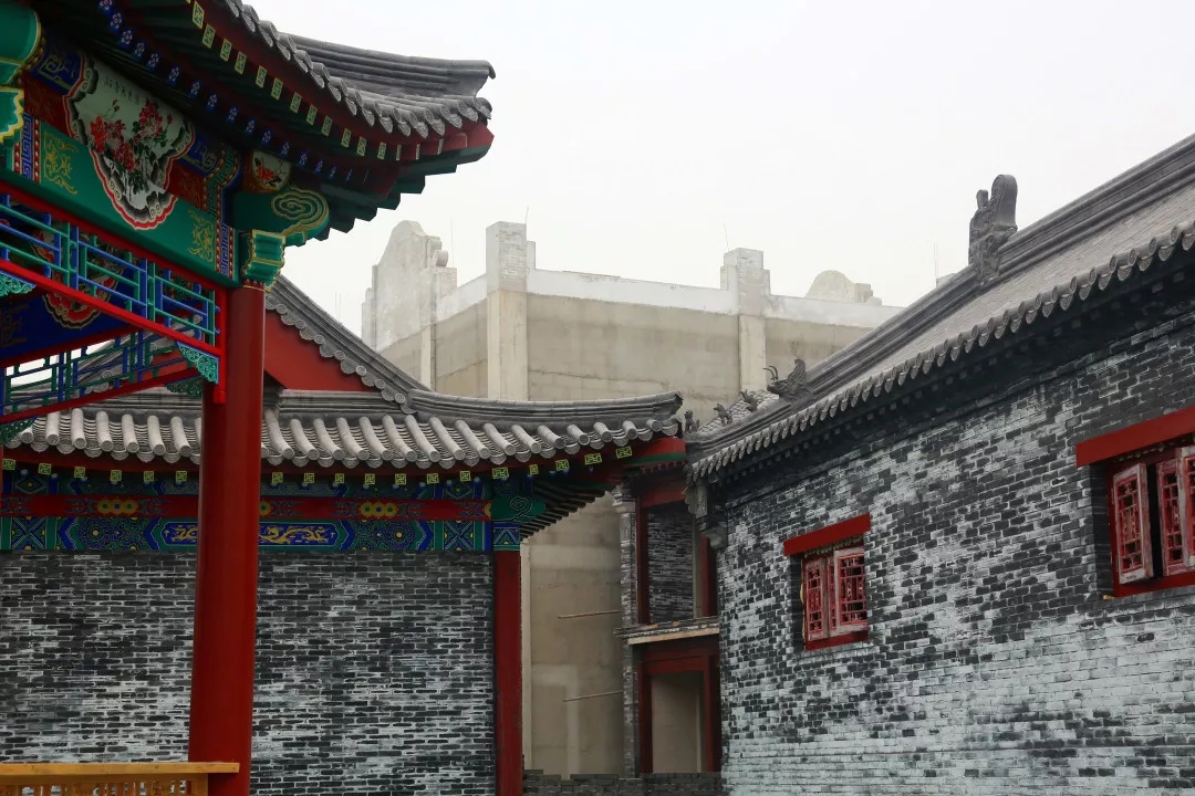 项目所有建筑中,城门楼是工程量最大、工期最长的单体建筑,其中,城墙全部采用手工砖砌筑,经过人工修整后的砖块古朴素雅,并无过分雕饰痕迹。进入城门楼内部,柱与梁之间均为传统木质斗拱支撑,城门楼的彩绘部分尤为明亮突出,采用的是旋子彩绘形式,一般经过6道工序,一平方米的彩绘需要一名绘画师傅耗时约半天一次成型。