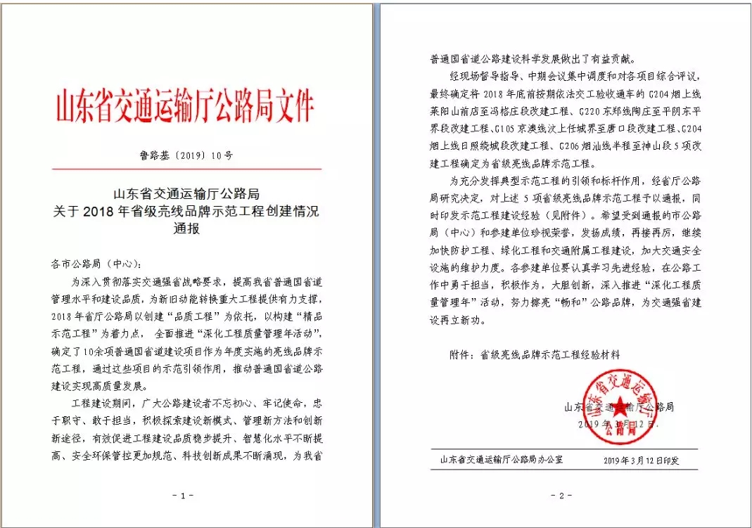 所属金诺公司负责代建管理、金衢公司负责设计、金曰等公司参与建设的G220东郑线陶庄至平阴东平界段改建工程(简称“G220平阴南段改建工程”)喜获山东省交通运输厅公路局“2018年省级亮线品牌示范工程”荣誉称号。