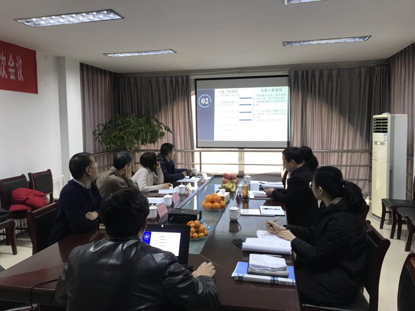 总经理乔荣民向董事会汇报领导班子职责及分工,副总经理史明文汇报北控腊山污水处理有限公司施工进度计划。