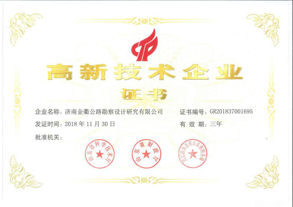 2019年3月14日,金衢公司喜获由山东省科学技术厅、山东省财政厅、山东省国家税务局和山东省地方税务局联合颁发的高新技术pg电子证书,这标志着金衢公司正式迈入国家级高新技术pg电子行列。