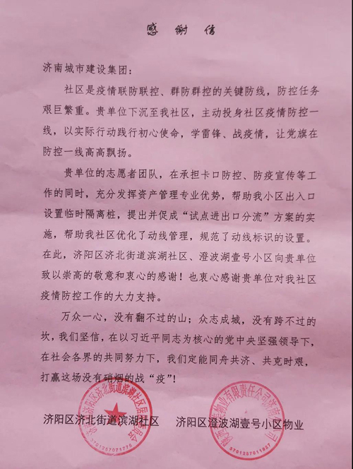 第十一批下沉社区疫情防控服务队即将完成执勤任务之时,济阳、济北街道社区将四面锦旗和一封饱含深情的感谢信送到志愿者手中,表达对济阳、济北小组志愿者的感谢与认可。