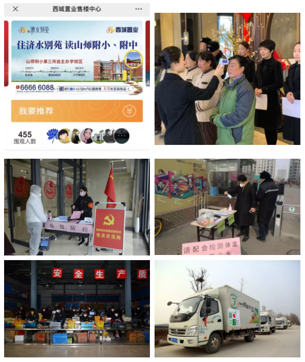 杨柳春风、西城·济水上苑等地产项目暂停营销接待工作,坚持每天开展全面、持续消毒,加强园区、写字楼的联防联控,启动线上VR看房通道,足不出户在家安心看房,让客户享受便捷、周到的服务。西城资产公司在西城大厦一层南门设置“消毒回廊”,公司防控小组每天到西客站东场综合体、西城大厦、东广场地下停车场、东广场地下餐厅及长清西部创新园项目、大学城 9 号楼、长清安置三区等 7 个项目督导检查疫情防控工作情况,确保区域防控措施落实到位。济西农场公司全员上岗,加班加点,将线上与线下销售平台相结合,每天向市内配送平价新鲜蔬菜,为疫情期间全市蔬菜市场供应和稳定做出了积极贡献。