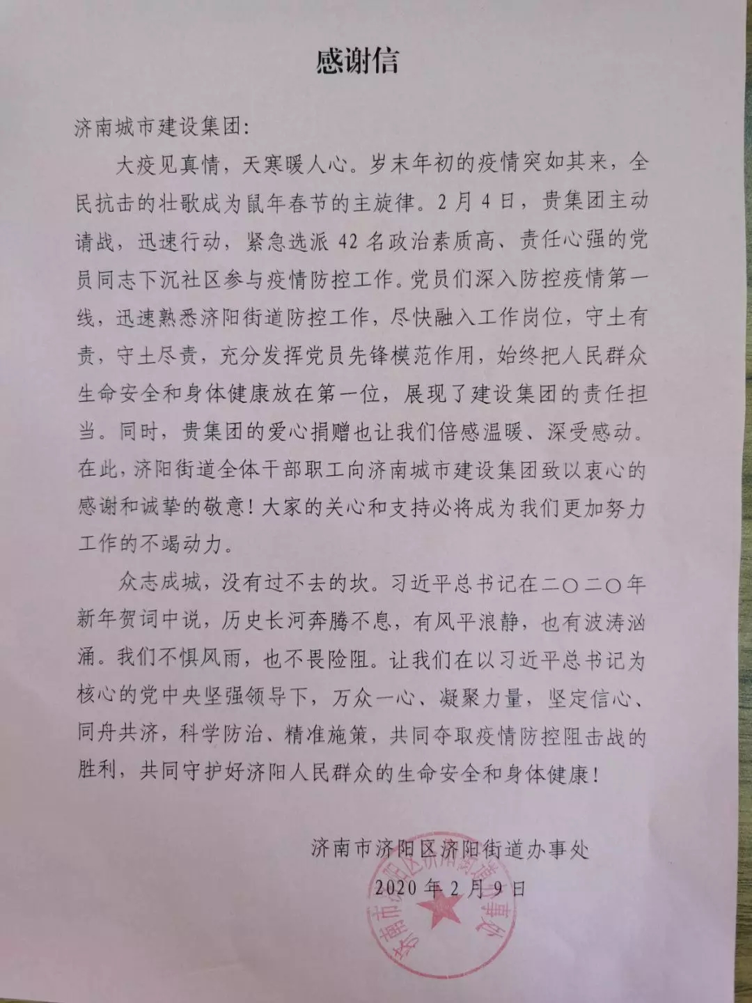 写了感谢信,济阳街道康瑞社区与雅居园物业管理有限公司还向吕仁镇、齐鹏飞两名党员同志赠送了写有“抗击疫情勇担当,志愿服务争先锋”的锦旗。
