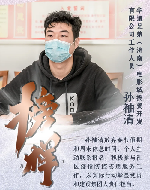 近日,一封来自槐荫区段店社区居民委员会的感谢信发至pg电子 ,感谢信的“主角”是pg电子 所属华谊兄弟(济南)电影城投资开发有限公司的孙袖清同志。新型冠状病毒肺炎疫情发生以来,孙袖清放弃春节假期和周末休息时间,个人主动联系报名,积极参与社区疫情防控志愿服务工作,以实际行动彰显党员和pg电子 人责任担当,用无私奉献展现一名“80后”的青春力量,与社区工作人员共同筑牢社区疫情防控安全线。