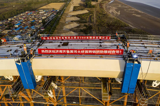 负责建设管理的跨黄通道工程又迎来重要节点,经过90天的连续作业,10月21日凌晨,齐鲁黄河大桥首跨拱肋顺利合龙。随着最后一节段拱肋的精准安装到位,项目建设再次取得重要节点性进展。
