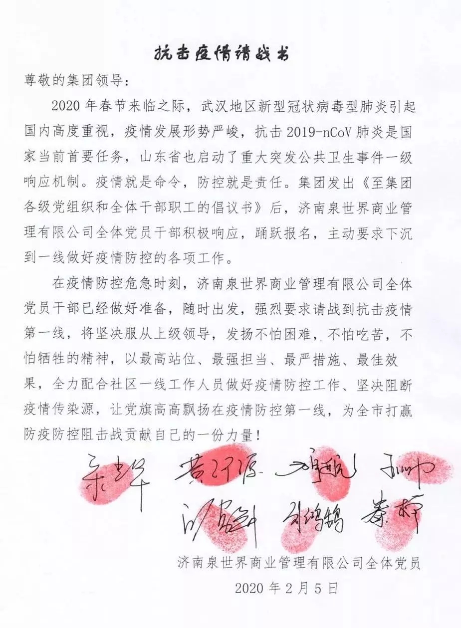 指示,部署工作任务。印象济南·泉世界执行董事兼总经理宋光华率先垂范带头报名,公司全体党员干部第一时间积极响应,踊跃报名,主动要求下沉到一线做好疫情防控的各项工作,以实际行动守初心、担使命,为打赢疫情防控阻击战作出新的更大贡献!最终,公司7名党员干部全部报名请求到抗击疫情一线工作,并在《抗击疫情请战书》上签字按手印。