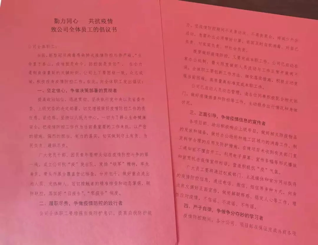 公司党支部、团支部向公司全体职工发出倡议,争做决策部署的贯彻者、疫情防控的践行者、疫情信息的宣传者、时间管理的学习者,勠力同心,共抗疫情!