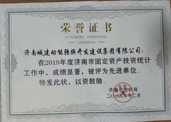 有限公司荣获济南市统计局“2019年度济南市固定资产投资统计工作先进单位”称号,冷见奇、潘文凯、周宇三名同志被评为“固定资产投资统计工作先进个人”。