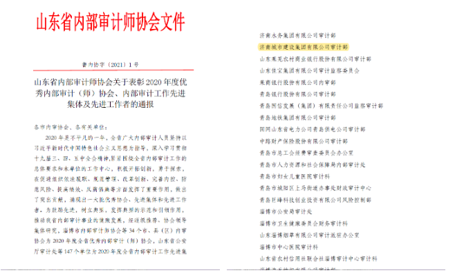 今年以来,通过加快建章立制,明确规定了审计年度计划制定、方案制定、证据收集、底稿日志编写、报告质量控制、档案管理等全流程标准,逐步形成了一整套行之有效的内部审计制度体系,并荣获“山东省内部审计工作先进单位”称号。