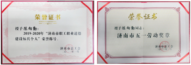 资产运营管理有限公司执行董事、党总支书记陈向勤获“2019-2020年度济南市职工职业道德建设标兵个人”荣誉称号,并被授予“济南市五一劳动奖章”。