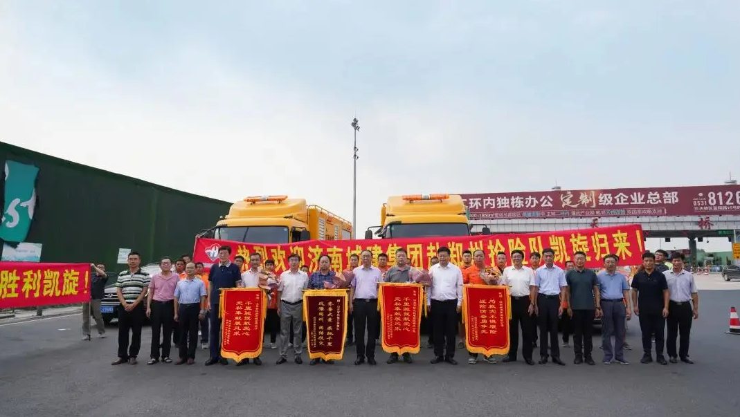 公司应急抢险队经过休整准备返济时,郑州惠济区老百姓自发来到现场,为救援队员们送上鲜花、食品等礼物,拉起“欢送山东省住建厅救援队英雄们平安回家”“向抢险救灾的英雄致敬”的条幅,夹道欢送应急救援队。