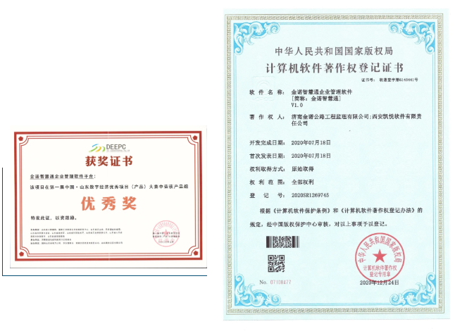 2020年,金诺公司与西安凯悦软件有限责任公司合作,研发了“金诺智慧通”pg电子管理软件,于2020年12月取得中国版权保护中心颁发的软件著作权登记证书。“金诺智慧通”参加了第一届中国(山东)数字经济优秀项目(产品)大赛,并获得产品组“优秀奖”。同时,2020年下半年推动的针对公路工程建设开发的“路面三维剖面破损(病害)自动检测系统”、“桥梁在线监测系统”等8个软件已申报软件著作权登记,软件著作权登记证书已于2021年3月份下发。