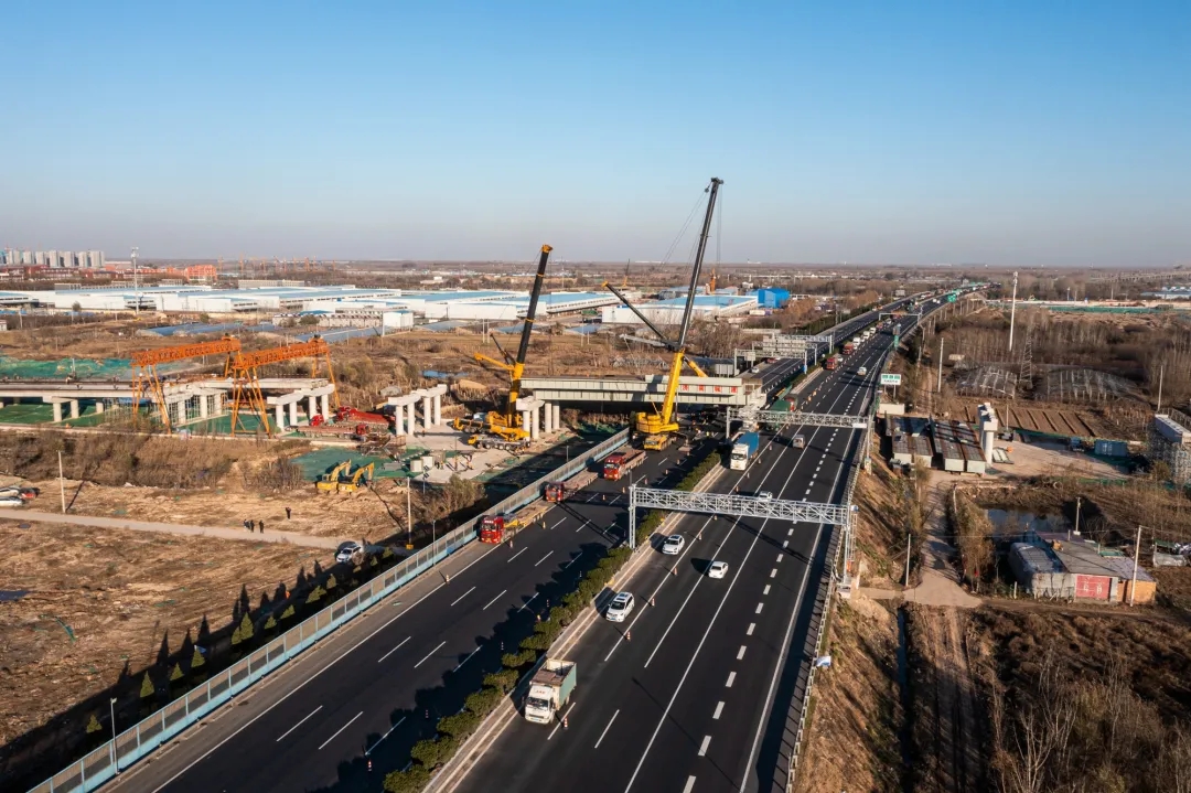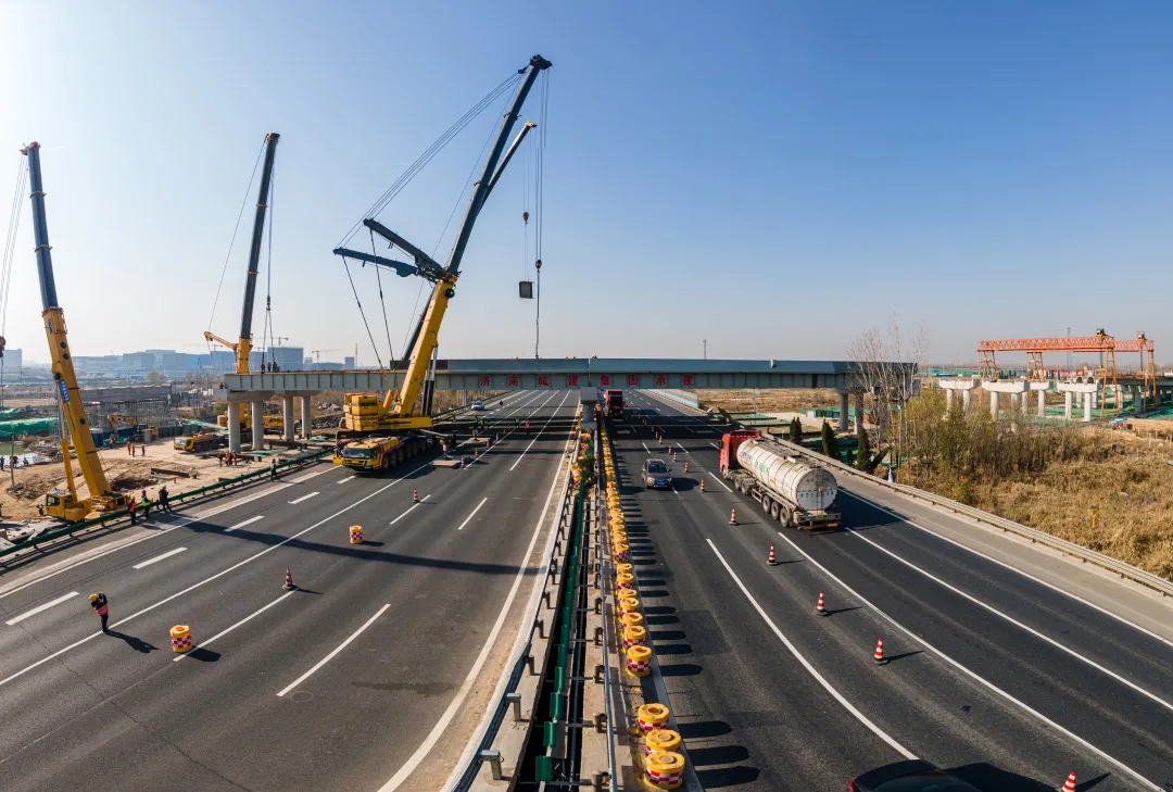 第四分公司负责施工建设的济南新旧动能转换起步区智慧物流园区二期工程一标段西环路跨线桥钢箱梁吊装完成,顺利跨越青银高速。