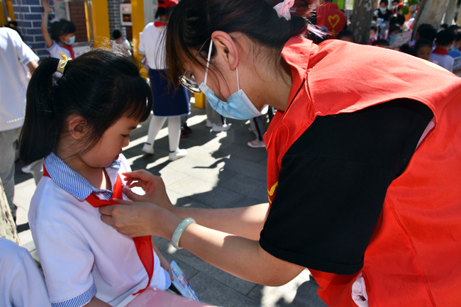 活动中,志愿者身着红色志愿者马甲,与小朋友们进行亲密互动,为孩子们佩戴少先队队徽,以通俗易懂的方式为大家讲解少先队知识、安全防疫知识,提醒提高安全防护意识。志愿者们与小朋友们有说有笑,其乐融融,为小朋友们送去pg电子