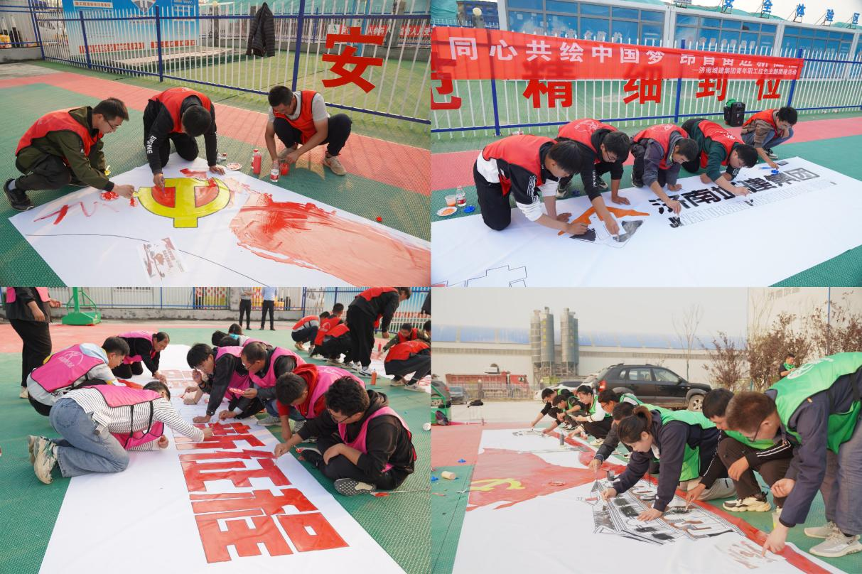 伴随着激昂的团歌,白色画卷在地上一字铺开,青年职工们手拿画笔围在两侧,用五彩斑斓的颜料绘制起波澜壮阔的画卷,一笔一画深情地表达出对党和国家的美好祝愿。每个线条都蕴藏着青年职工永远跟党走、筑梦新时代的坚定信念。