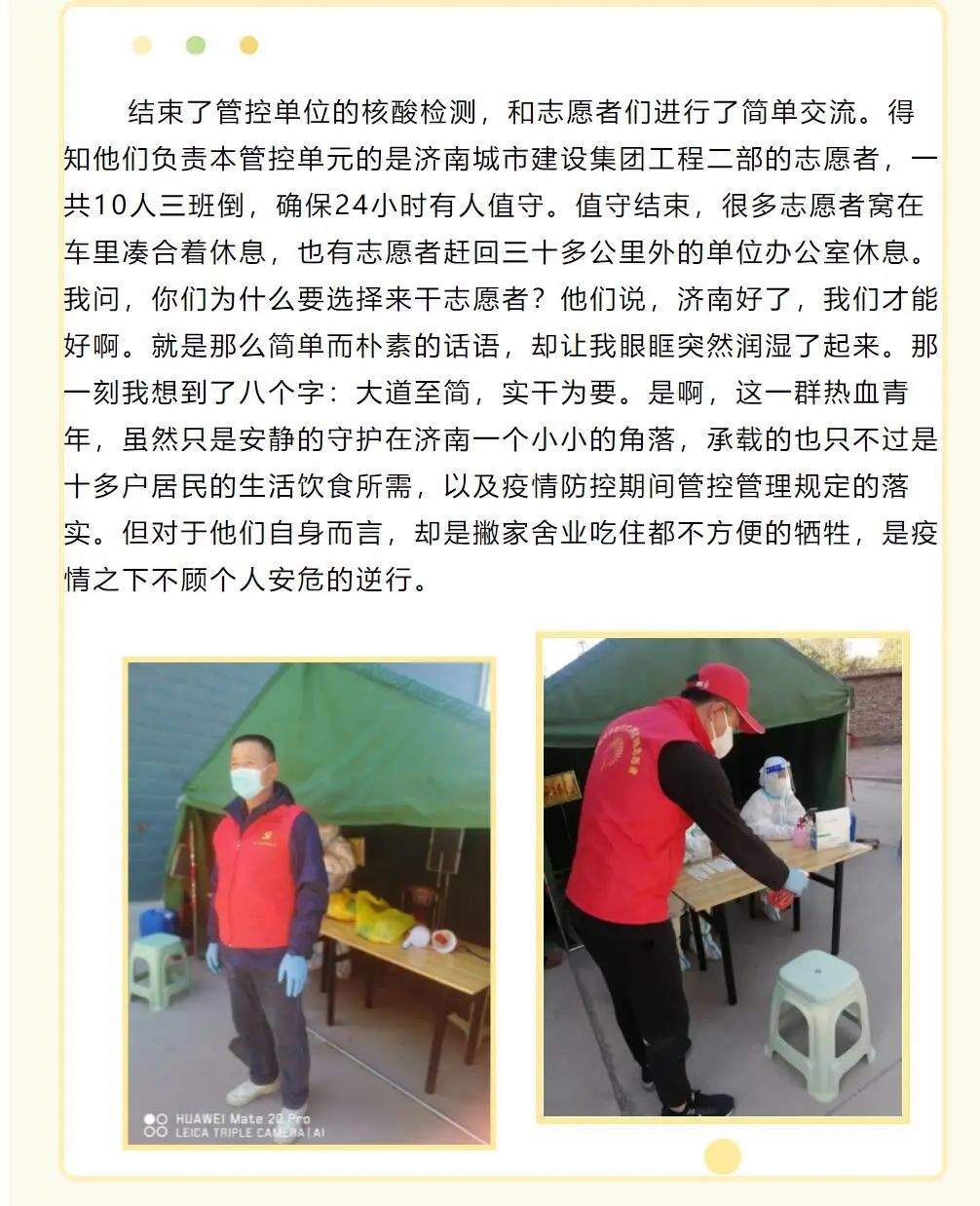 志愿者,涉及济南六个区的72个社区,他们下沉区域情况不同,各自分工职责不同,但“大道至简,实干为要”是他们共同的写照。他们在平日工作岗位上都是修路架桥、雷厉风行的“建设铁军”,在志愿服务工作中迅速转换角色,变身贴心细致的“暖心大白”和“红色卫士”,他们用力所能及的行动,或为居民解燃眉之急、或让他人心头一热,用微小却真挚的善举汇聚成疫情防控一线明媚的春光。让我们通过几个小故事去感受防疫一线的建设风采。