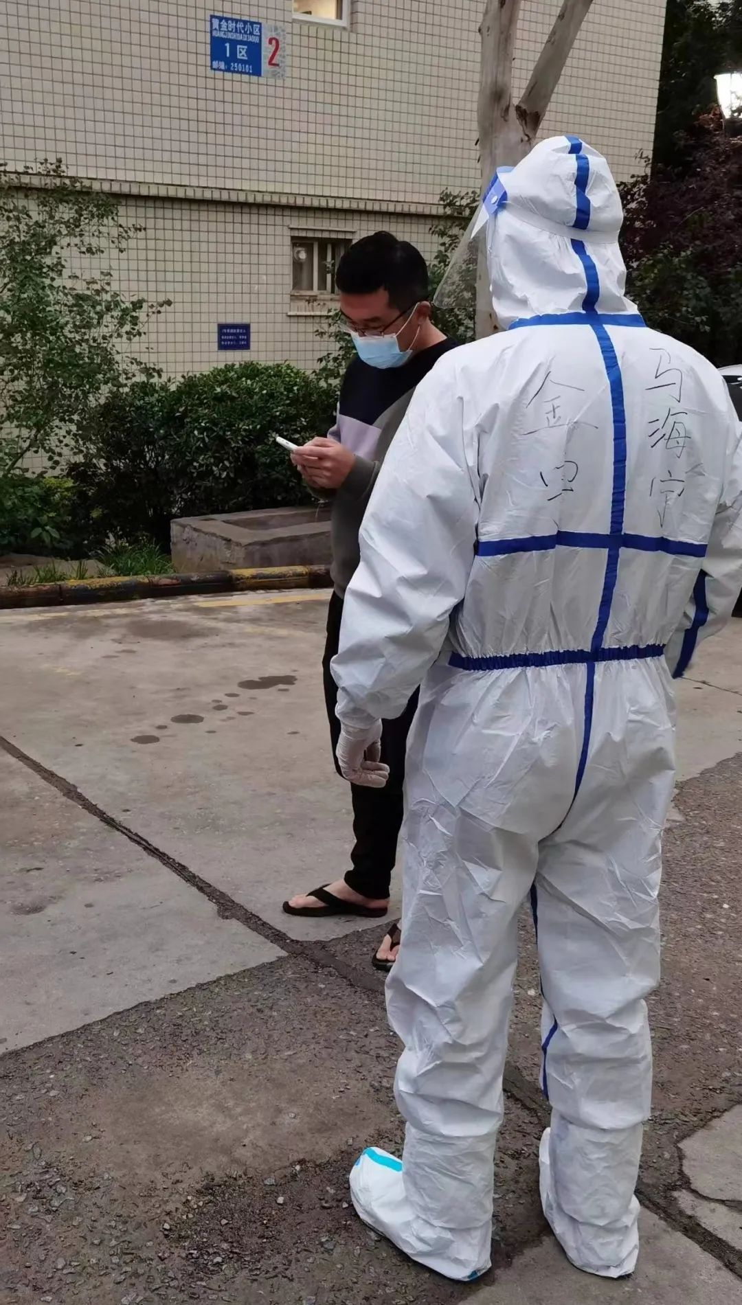 交通市政公司的马海宁下沉到高新区黄金时代社区,主要负责居民生活物资配送、协助核酸检测等工作。一天晚上结束工作时已是晚上十点钟,外面还下起了冷雨,下楼之后看到两位医护人员站在楼下等人,而且穿着短袖。主动询问后得知对方是外地援济医护人员,正在等居委会的人来接他们。“虽然素不相识,但都是参与疫情防控工作的,感觉是一个战壕的人,而且人家是大老远跑来帮助我们”,马海宁便主动把他们送回了住处,送下他们后,也没留姓名和联系方式,马海宁便匆匆赶回了40多公里外的家中。