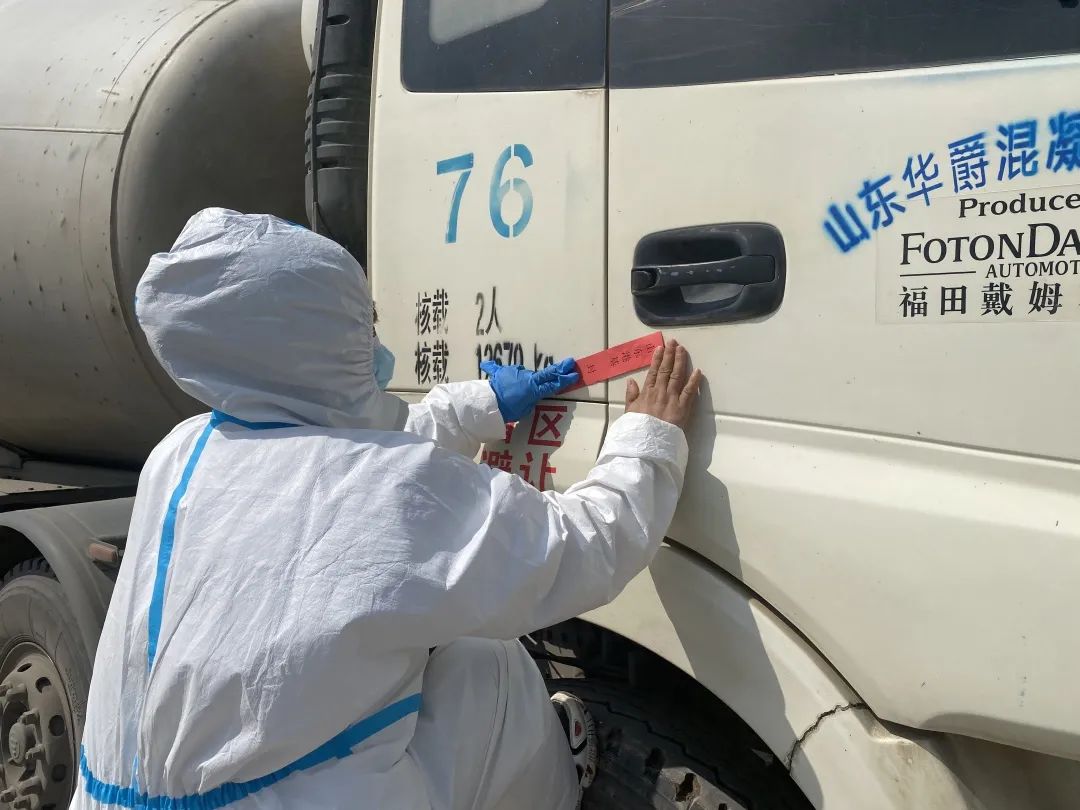 目前的建设阶段,施工现场必须有钢筋、混凝土的持续供应。工地设置了材料进场专用过渡区,对材料进行防疫消杀后才能进入现场使用。在封闭区门口,记者看到,两辆混凝土搅拌车正准备进入现场作业。管理人员在进行必要的信息查验登记后,在车门贴上封条,对车体消杀之后,搅拌车顺利进入了现场施工。宋丹生介绍,贴封条、禁止司机下车,可最大限度避免施工人员与外界的接触。