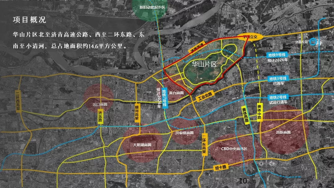 华山片区总占地面积约14.6平方公里,地处济南市东北部,北邻起步区,与鹊山遥相呼应,区位优越。片区规划剩余可出让用地约1666亩,拟采用整体策划研究、分期实施的方式推进。