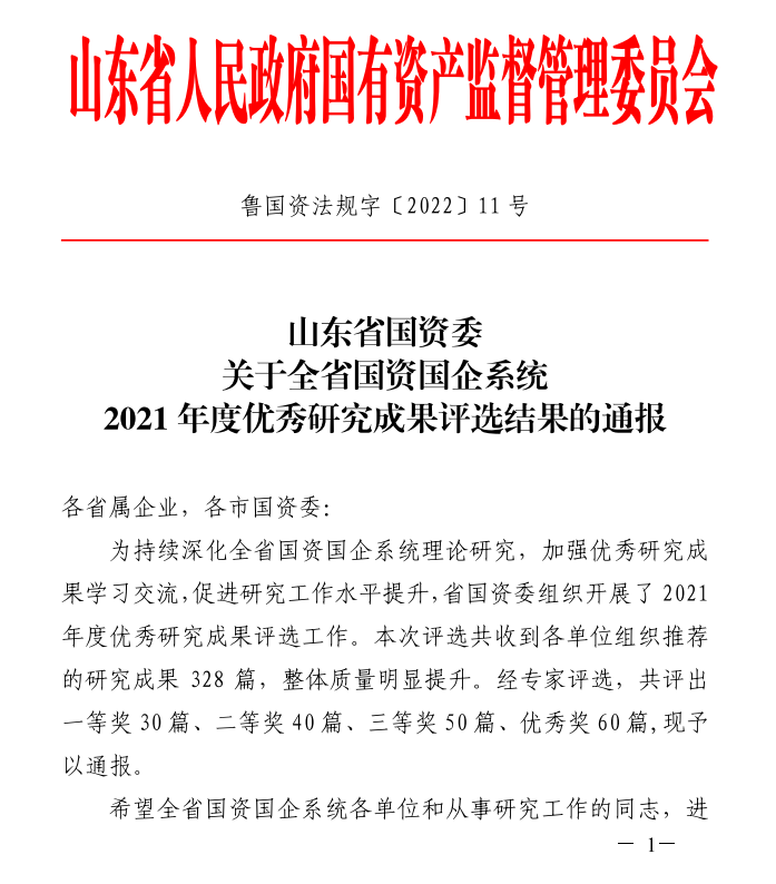 近日,山东省国资委发布了《山东省国资委关于全省国资国企系统2021年度优秀研究成果评选结果的通报》(鲁国资法规字〔2022〕11号)文件,pg电子