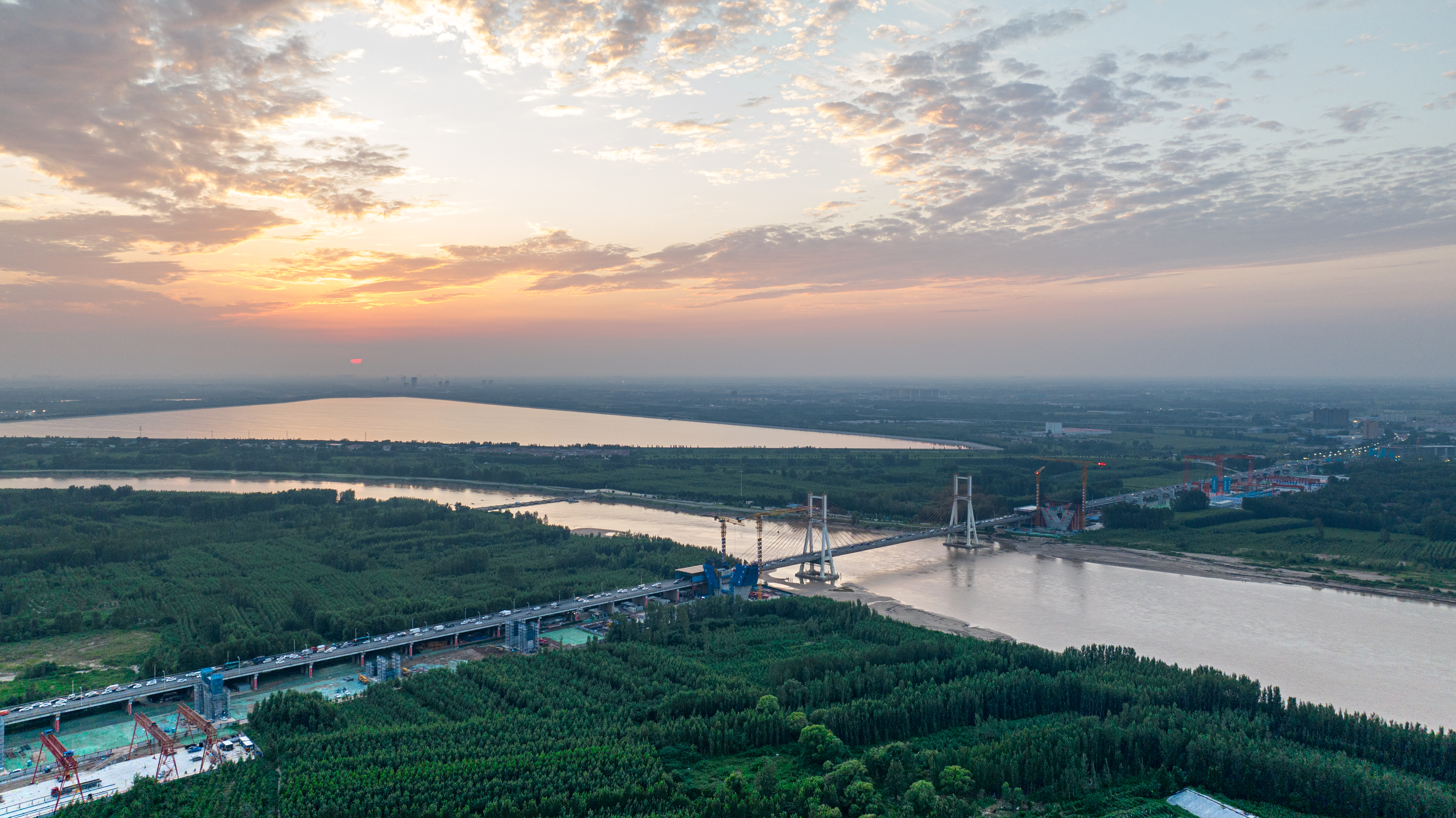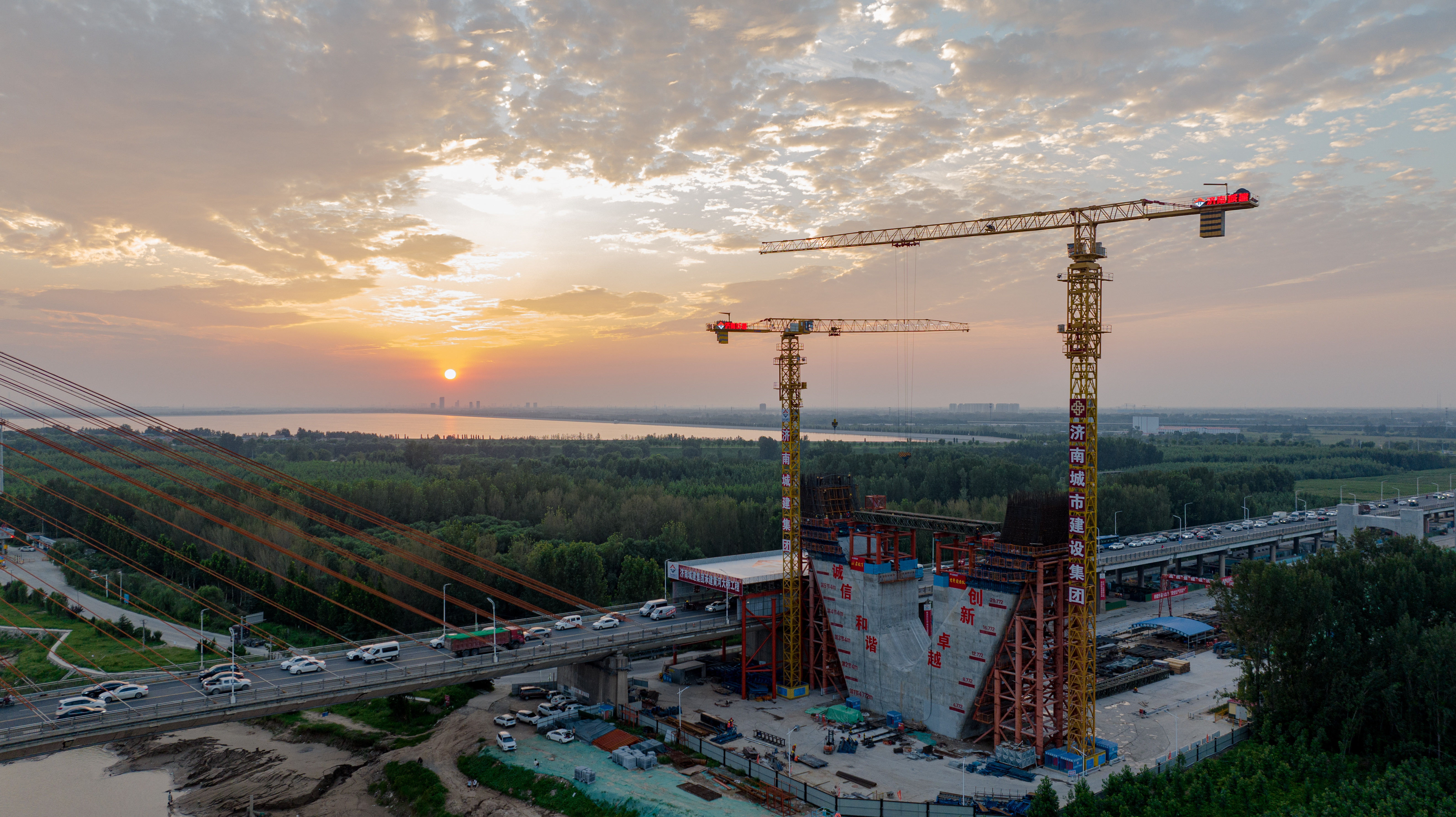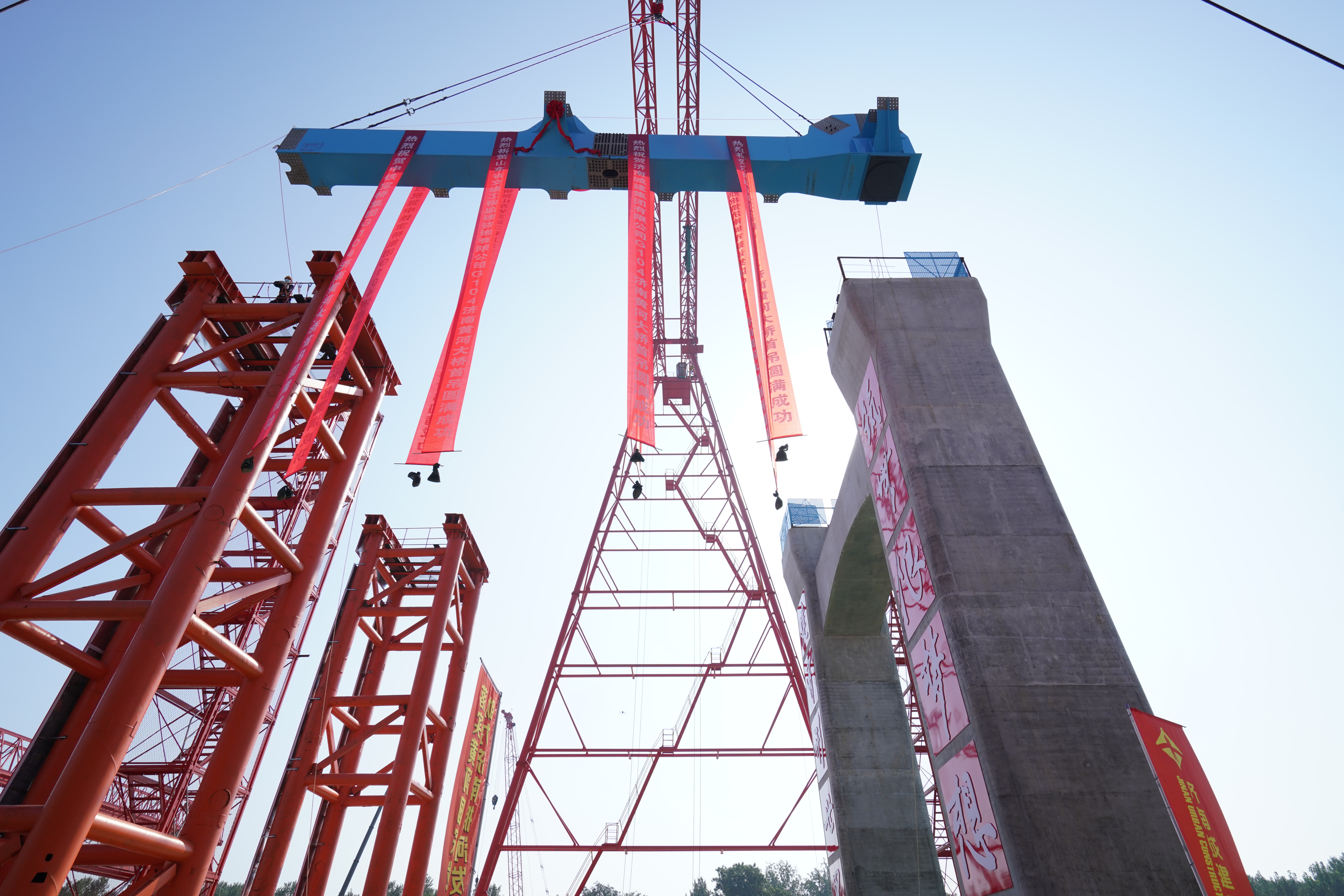 项目全长7.748公里,其中主线桥梁长6.87公里,黄河大桥主桥为主跨488米的双塔双索面钢桁梁斜拉桥,与既有G104济南黄河公路大桥(主跨220米双塔混凝土斜拉桥)并行建设,新、老桥中心间距33.5米,为黄河上第一座并桥建设工程,是黄河上跨径最大、钢桥总长最长的公轨分层合建桥梁。此次首节段钢桁梁架设完成,标志着项目建设进入桥梁上部施工阶段,工程建设有序推进。