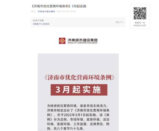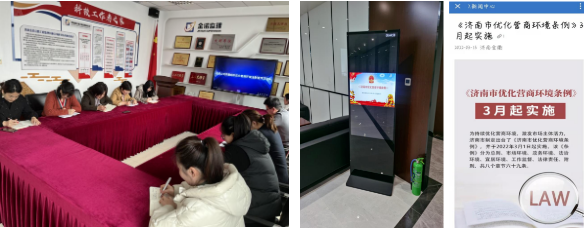 在微信公众号推送《<济南市优化营商环境条例>3月起实施》推文,同时通过电子屏投放、制作易拉宝等多种形式进行宣传,不断强化干部职工优化营商环境的理念,营造良好舆论氛围。
