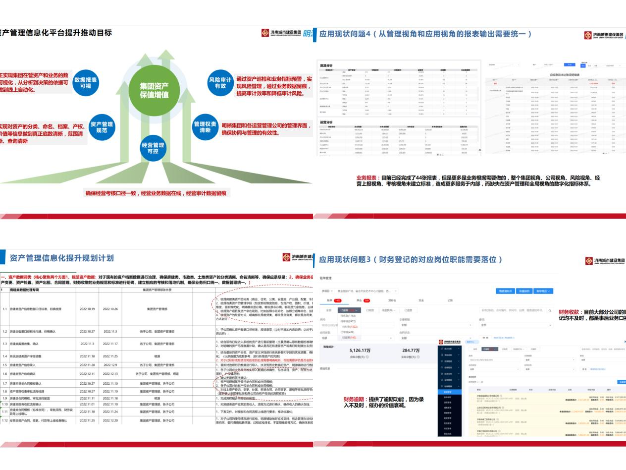 资产管理需求,进行了细致总结分析梳理。就目前系统存在数据可用性不完整、业务在线不及时、对数口径不一致、管理范围尚不明确等问题制定了推进目标。会议要求,要进一步规范资产管理、协调推进明析管理权责、实现经营管理可控和数据报表可视、推进开展有效风险审计;要持续调优资产数据、进一步完善报表体系、提升应用场景、优化使用功能。