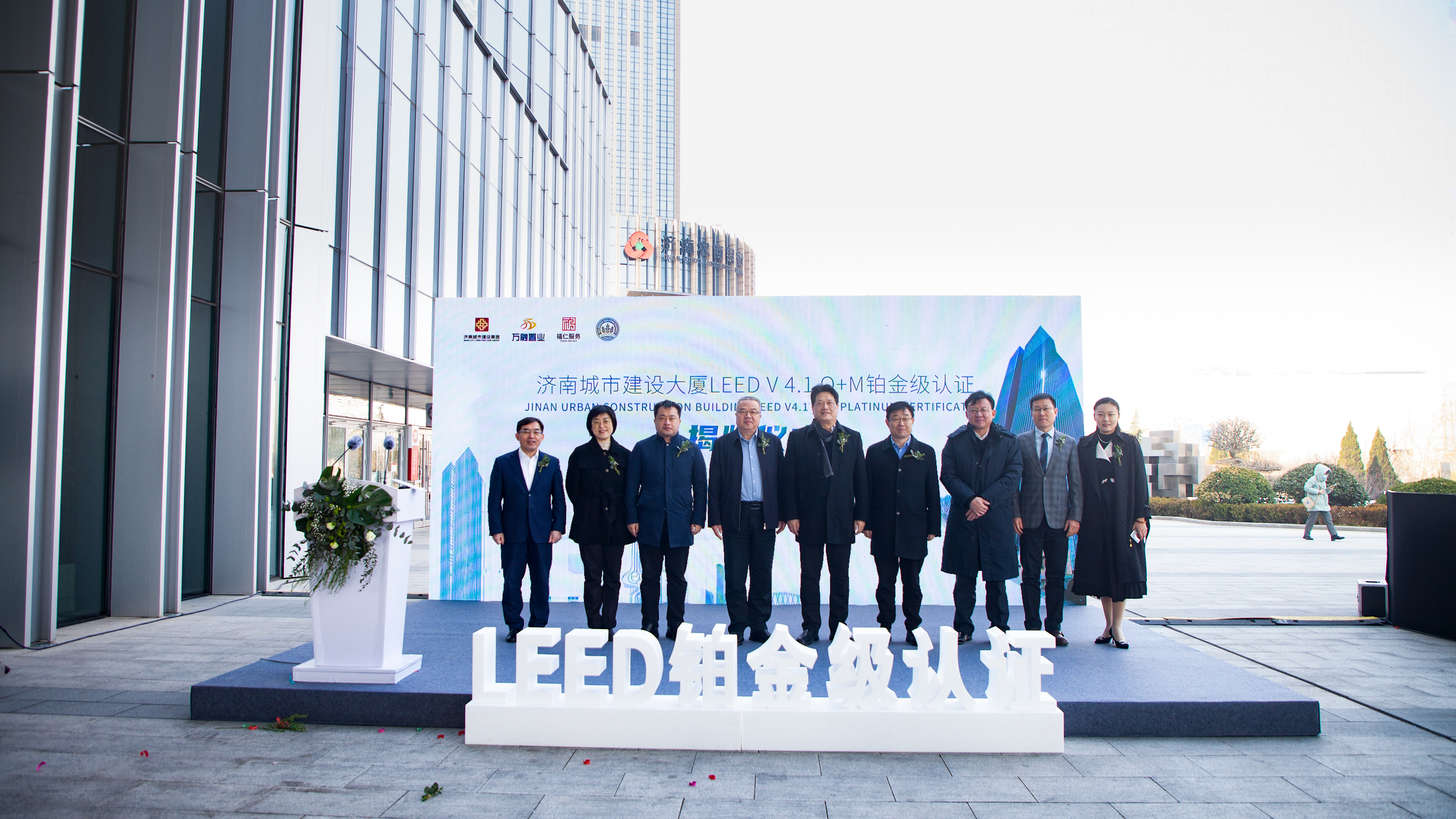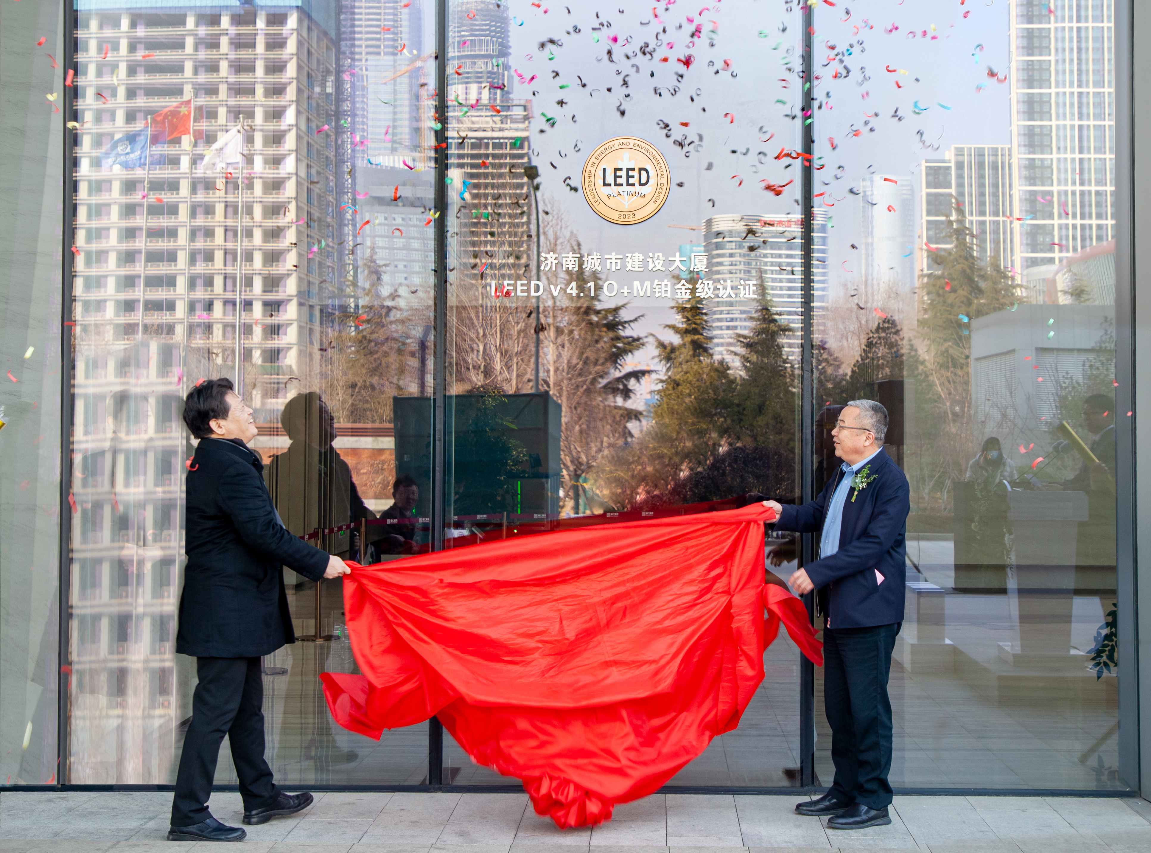 2月16日上午,济南城市建设大厦LEED v 4.1 O+M铂金级认证揭牌仪式举行。市城乡和住房建设局副局长张庆华,市住建局绿色建筑节能与科技处处长满意,pg电子
