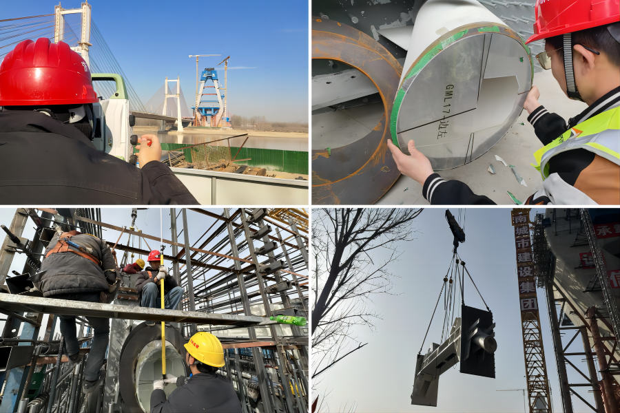 主塔上塔柱钢锚梁共17对,单个最大重量9.3吨,索导管长度最大达5.4米。项目部根据导管尺寸,专门设计定制管口测量工装,在钢锚梁吊装前安装定位工装,实现吊装动态观测,将“隐形点”可视化,保证了预埋准确度,大幅提升施工作业工效。