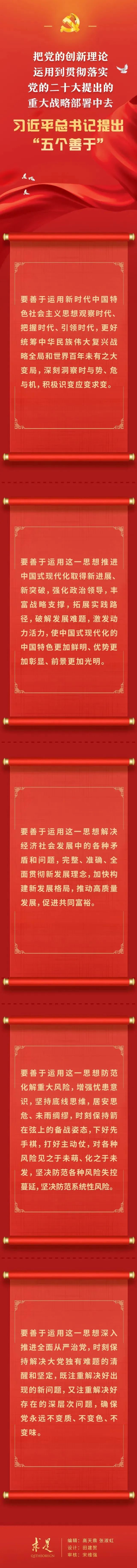 如何把党的创新理论运用到贯彻落实党的二十大提出的重大战略部署中去?在2023年第10期《求是》杂志刊发的习近平总书记重要文章《在二十届中央政治局第四次集体学习时的讲话》中,总书记提出“五个善于”的明确要求。