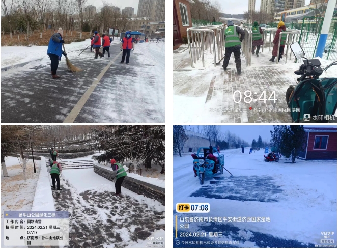 园区管理有限公司提前做出预判并发布相应通知,为恶劣天气应急管理做好全面准备。华山、济西湿地、济南园博园三大景区及时响应、迅速行动,全力组织开展扫雪除冰工作,利用扫雪车、雪锹、雪铲等工具,对景区内各出入口、广场、道路台阶等重点部位进行清雪、清冰工作并铺设相应防滑措施,保障道路畅通与市民游客安全,最大限度减少低温雨雪天气影响。