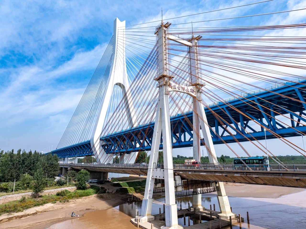 1982年7月,济南黄河大桥(老桥)建成通车,作为当时亚洲跨径最大的公路斜拉桥,入选济南“1978—1988泉城十大景观”。如今,新桥与老桥“并肩”相望,成为黄河上第一座不等跨并桥建设工程,也是黄河上跨径最大、钢桥总长最长的公轨分层合建桥梁,刷新“跨黄”桥梁纪录。